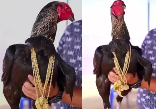 ఔను ఆ కోడి పుంజు బంగారు ఆభరణాలు, పులి గోరుతో దర్జా ఒలకపోస్తోంది .భీమవరం దుర్గాపురంలో జరిగిన కోడిపందాలలో నిలువెల్లా బంగారం ధరించిన కోడిపుంజు ప్రత్యేక ఆకర్షణగా నిలిచింది. ఆ పుంజు యజమాని తన కోడిపుంజును 15 కాసుల బంగారు గొలుసు, పులిగోరుతో ప్రత్యేకంగా అలంకరించాడు.