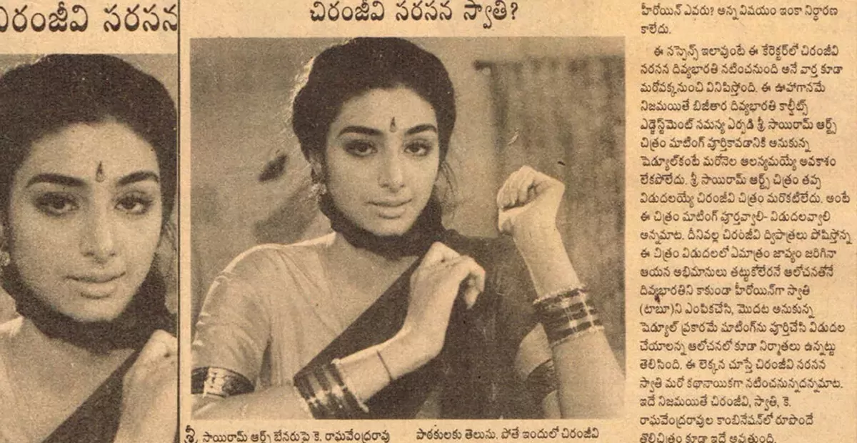 ‘రౌడీ అల్లుడు’లో శోభన, దివ్యభారతి హీరోయిన్స్ గా చేసిన విషయం తెలిసిందే. శోభన ని ఒక హీరోయిన్ గా ఫిక్స్ చేసినప్పుడే మరో హీరోయిన్ గా దివ్య భారతిని అనుకున్నారు. కాకపోతే ఆమె ఉంటే మెగాస్టార్ నుంచి వచ్చే సినిమా మరొకటి లేదు కాబట్టి, మూవీ లేట్ అయితే ఫ్యాన్స్ ఒప్పుకోరు. కాబట్టి దివ్యభారతి ప్లేస్ లో మరో నాయిక ‘స్వాతి'(స్వాతి)ని సెకండ్ హీరోయిన్ గా ఫిక్స్ చేసి షూటింగ్ కి వెళ్లాలని ‘రౌడీ అల్లుడు’ టీం అనుకుంది. ఆ పేపర్ కటింగ్ లో ఈ విషయం మొత్తం స్పష్టంగా ఉంది. ఈ వార్తని చూసి ఫ్యాన్స్ తో మూవీ లవర్స్ మురిసిపోతున్నారు. మరి ఈ రోజు రౌడీ అల్లుడు చూడటం పక్కా. ఇక స్వాతి ఎవరో కాదు టాప్ హీరోయిన్ గా తన సత్తా చాటిన టబు(టబు).